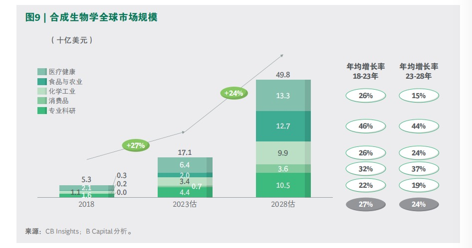 據上海合成生物學創新中心和波士頓諮詢公司共同發佈的《中國合成生物產業白皮書 2024》顯示,全球合成生物學市場規模從2018年的53億美元增長到2023年的超過170億美元,平均年增長率達27%,預計未來將持續增長,並在2028年達到近500億美元。
