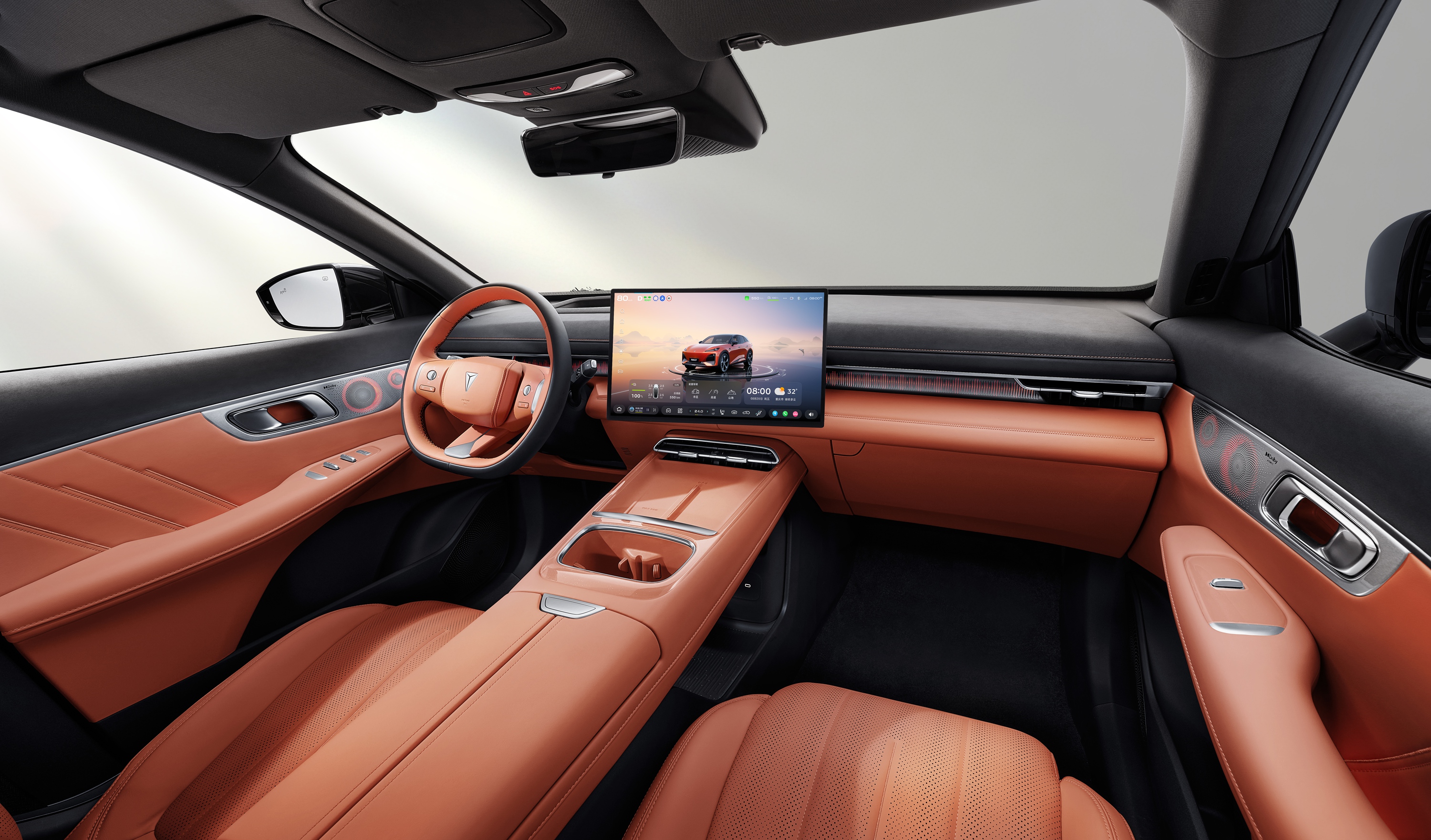 進入內部,新車採用環抱式懸浮中控台設計,內飾由超纖絨感麂皮包覆,並搭載有皮質打孔座椅、氛圍燈、全景天幕、電動遮陽簾、後排隱私玻璃等配置。