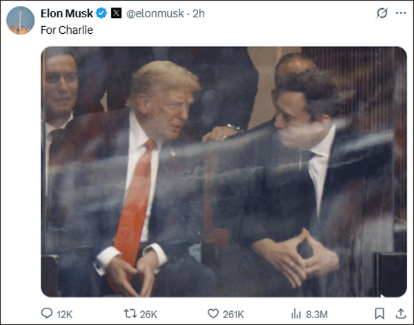 週日晚間,馬斯克在社交平台發佈了他與特朗普同框的畫面,並配文“獻給查理”。這段簡潔的文字背後,暗示着這場和解對逝者的告慰,似乎也為這段短暫的恩怨畫上了暫時的句號。
