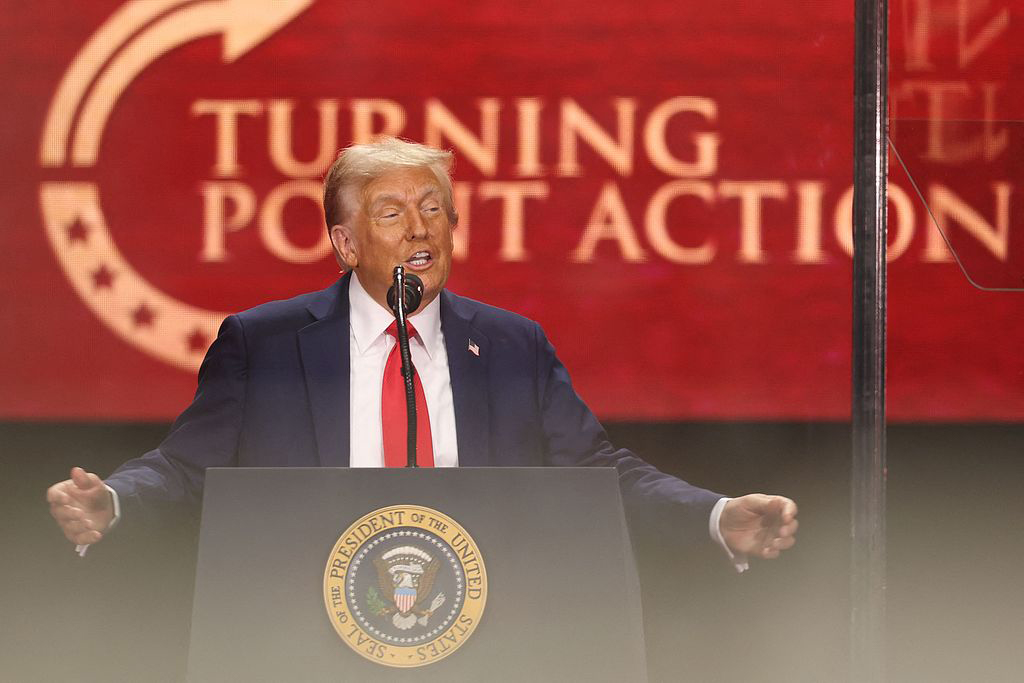 當地時間9月21日,特朗普在查理·柯克的公眾追悼儀式上發表講話。 視覺中國