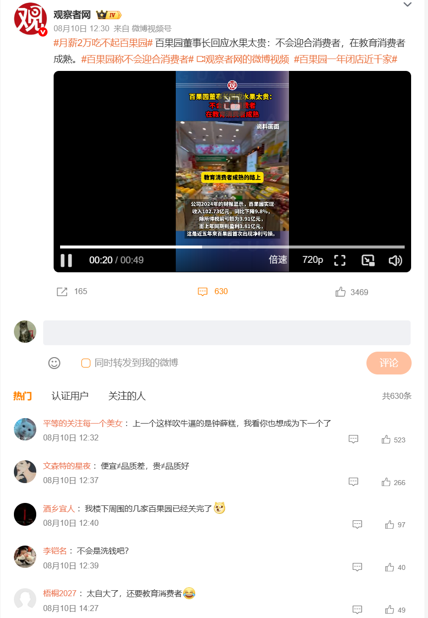 值得一提的是,百果園還因降價話題屢次登上熱搜。2025年6月底,面對價格質疑,餘惠勇在視頻中稱價格已難降,將挑選部分產品優惠回饋,同時全方位管控成本,積極響應消費者呼聲,此回應較為常規,未引發太多波瀾。