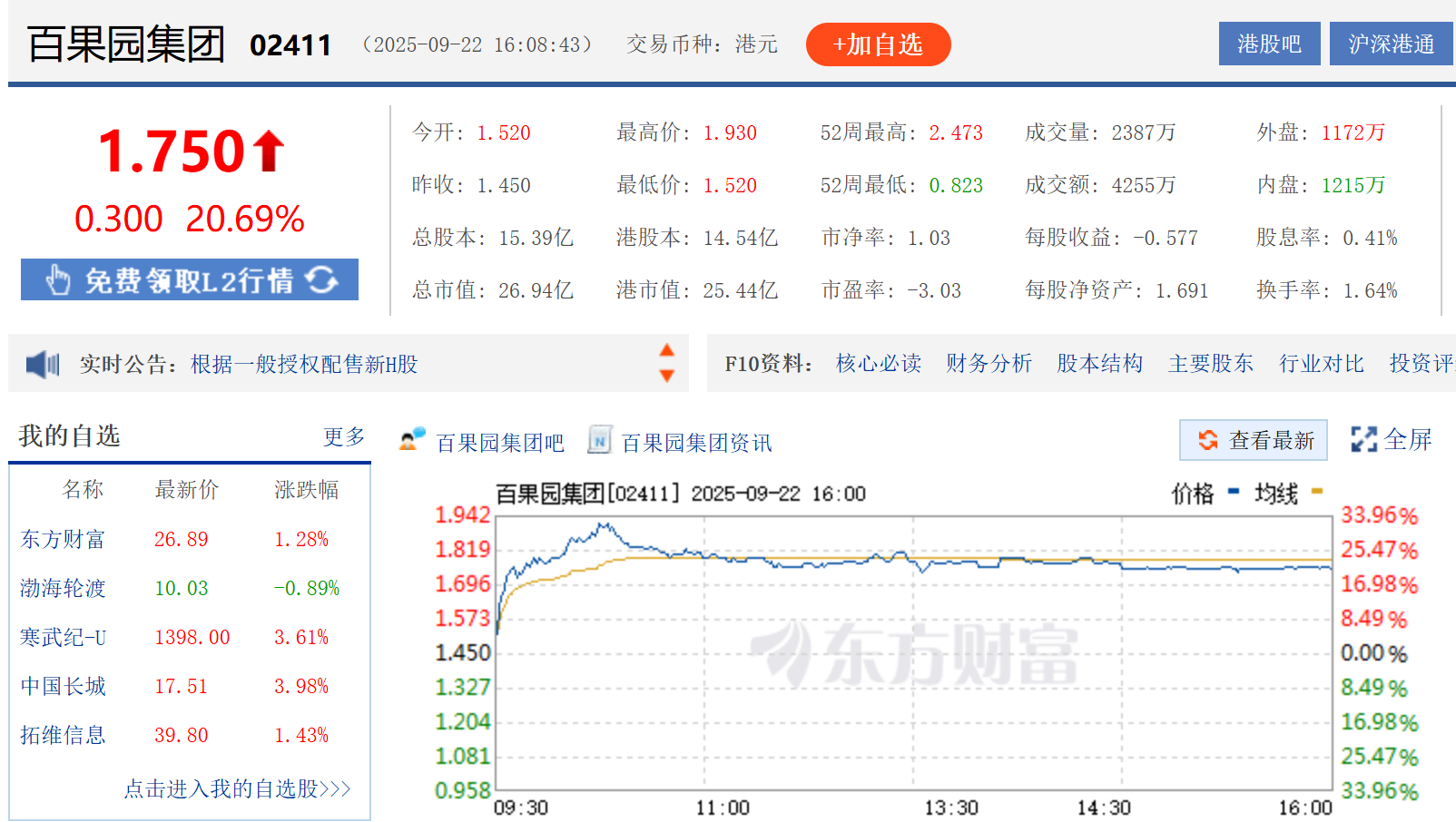9月22日,百果園每股開盤價為1.520/港元,盤中最高觸及1.930/港元,最低下探至1.520,最終每股收盤價為報1.750/港元,漲幅達20.69%。