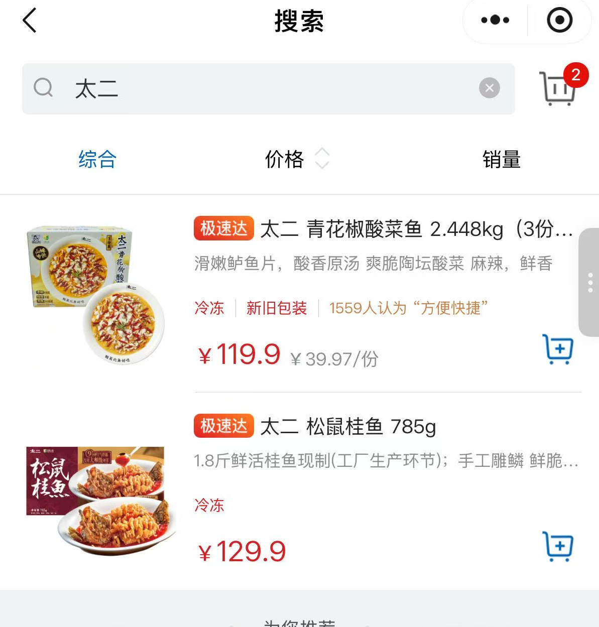 九毛九對預製菜零售渠道的加碼力度明顯。觀察者網在山姆小程序搜索發現,目前除了太二的酸菜魚,還推出了太二松鼠桂魚。