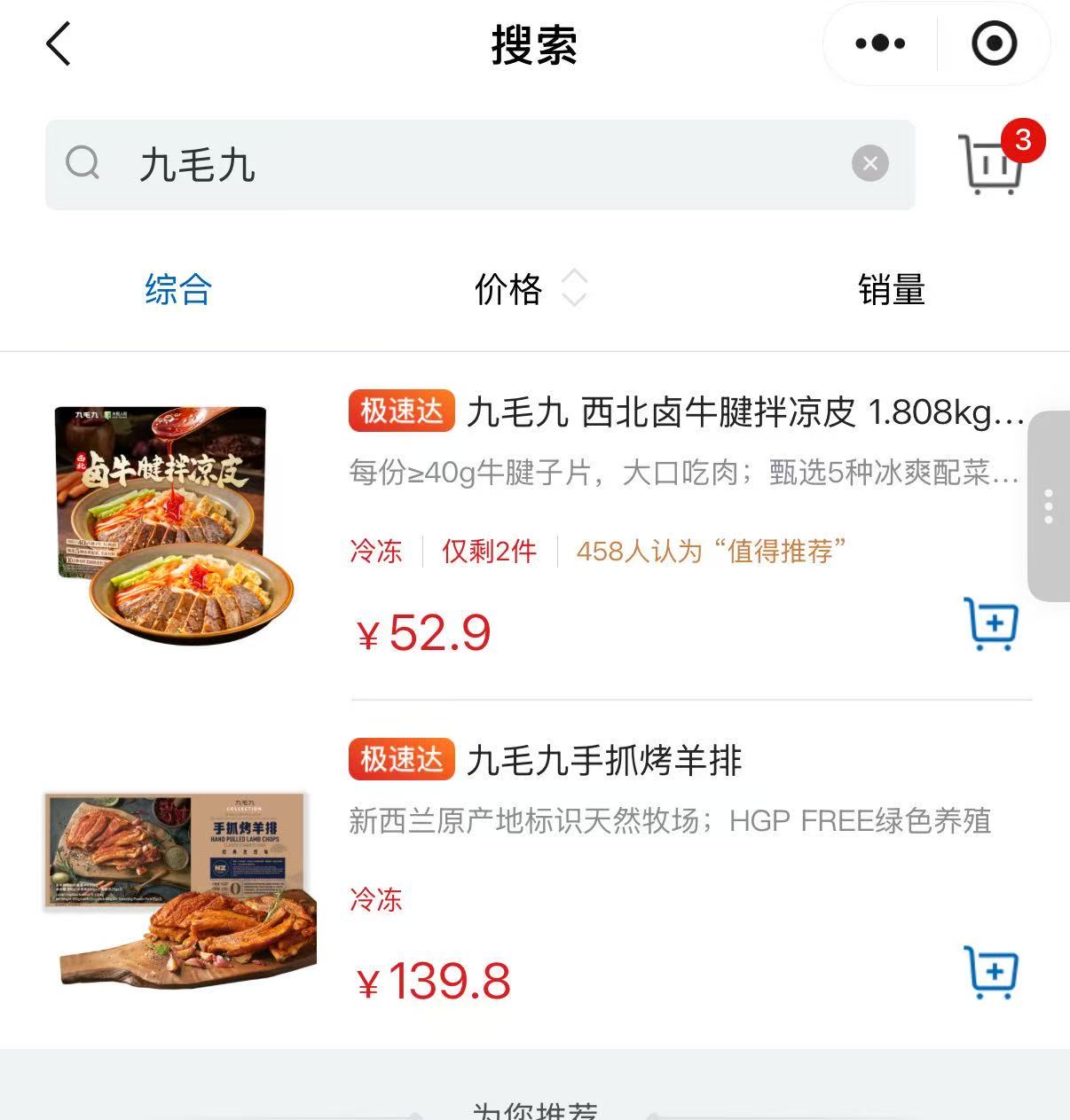 與松鼠桂魚先後入駐山姆的還有九毛九的羊排預製菜。據社交媒體消費者發佈的評測帖顯示,太二的松鼠桂魚和九毛九手抓烤羊排的上市時間都在八至九月。今年4月,九毛九還在山姆推出了西北滷牛腱拌涼皮。僅今年一年,九毛九在會員制商超零售渠道就上新了至少三次。
