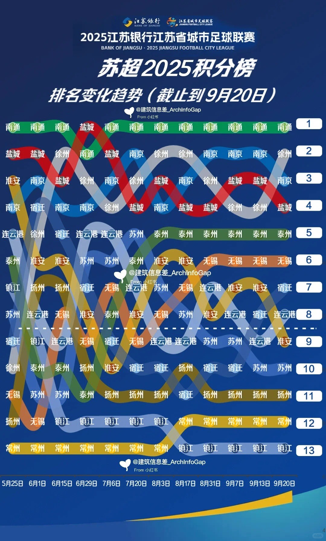 前十二輪江蘇蘇超積分榜變動情況,目前的第五名至第九名都有晉級可能。