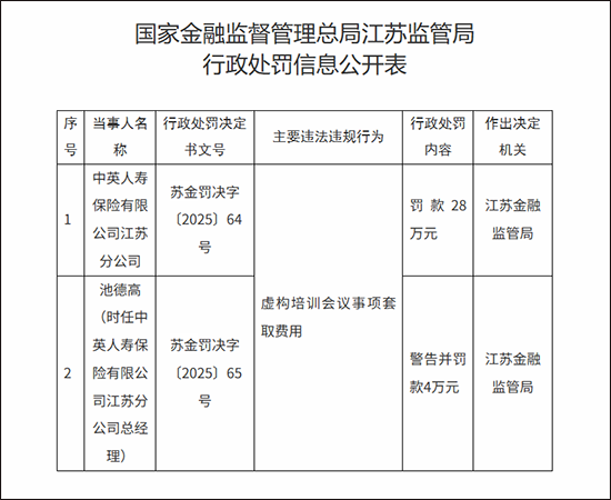 國家金融監管總局網站9月19日消息,江蘇監管局行政處罰信息公開表顯示,因虛構培訓會議事項套取費用,中英人壽保險有限公司江蘇分公司被罰款28萬元,時任江蘇分公司總經理的池德高,因對同一違規行為負有管理責任,同步被給予警告並罰款4萬元。