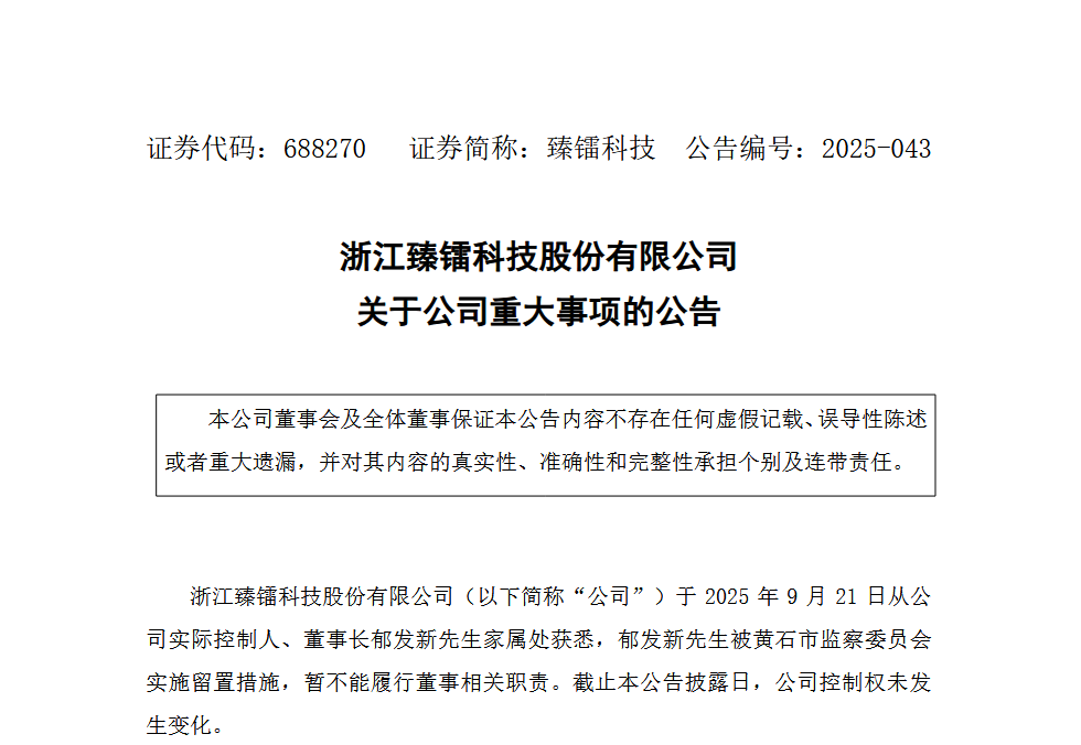 9月21日晚間,臻鐳科技發佈公告稱,公司當日獲悉,公司實際控制人、董事長鬱發新被黃石市監察委員會實施留置措施,暫不能履行董事相關職責。截至該公告披露日,公司控制權未發生變化。