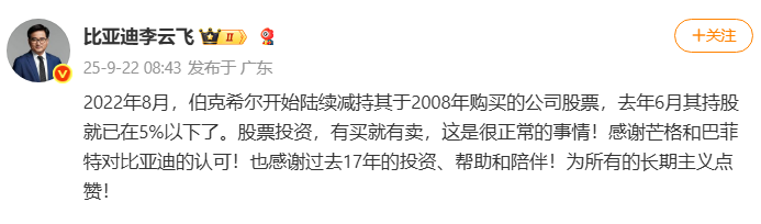 9月22日, 比亞迪集團品牌及公關處總經理李雲飛對此回應表示:“2022年8月,伯克希爾開始陸續減持其於2008年購買的公司股票,去年6月其持股就已在5%以下了。股票投資,有買就有賣,這是很正常的事情!感謝芒格和巴菲特對比亞迪的認可!也感謝過去17年的投資、幫助和陪伴!為所有的長期主義點贊! ”