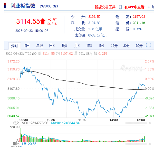 9月23日,A股三大指數漲跌不一,市場先探底後回升,創業板指數尾盤快速翻紅,此前一度下跌逾2%。