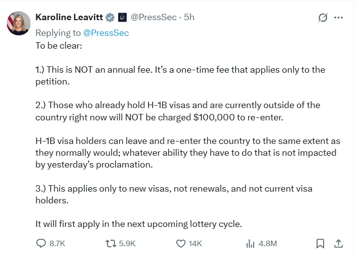 白宮發言人萊維特在社交媒體上就H-1B簽證申請收費做出澄清
