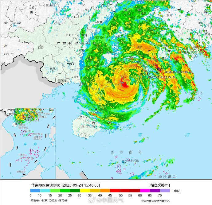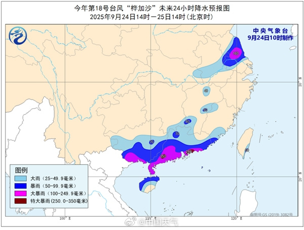 中央氣象台預計,9月24日14時至25日14時,廣東大部、廣西中南部、福建東南部、海南島中北部、江蘇中南部、安徽中部、湖北東部、江西北部和西南部、湖南南部、台灣島東南部等地部分地區有大到暴雨,其中,廣東中南部、廣西南部、江蘇中部等地部分地區有大暴雨,廣東沿海和西部等地局地特大暴雨。