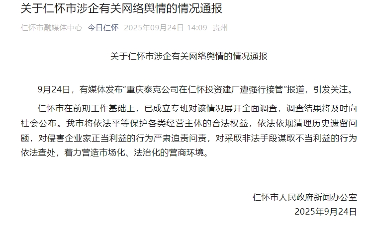 仁懷市在前期工作基礎上,已成立專班對該情況展開全面調查,調查結果將及時向社會公佈。將依法平等保護各類經營主體的合法權益,依法依規清理歷史遺留問題,對侵害企業家正當利益的行為嚴肅追責問責,對採取非法手段謀取不當利益的行為依法查處,着力營造市場化、法治化的營商環境。