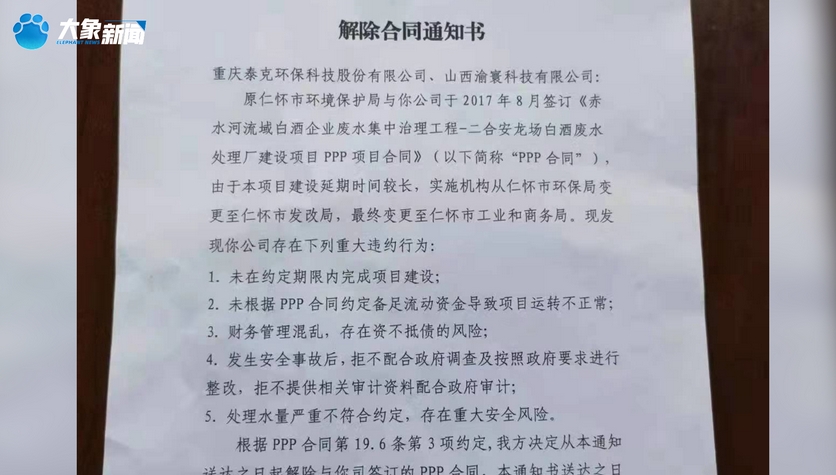 然而在2022年6月10日,代表仁懷市政府的項目實施機構仁懷市工業和商務局(以下簡稱工業局),向重慶泰克和另一家中標公司下達“解除合同通知書”。