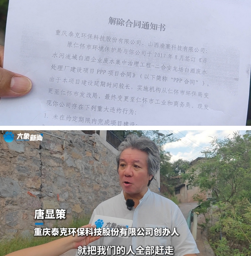 唐顯策説,事前沒有接到任何通知,當天仁懷市工業局和其它職能部門工作人員將廠裏員工集中到一起,宣讀“解除合同通知書”,稱重慶泰克方存在重大違約行為,即日解除所簽訂PPP項目合同。隨即廠裏員工被要求兩小時內收拾私人物品離開。