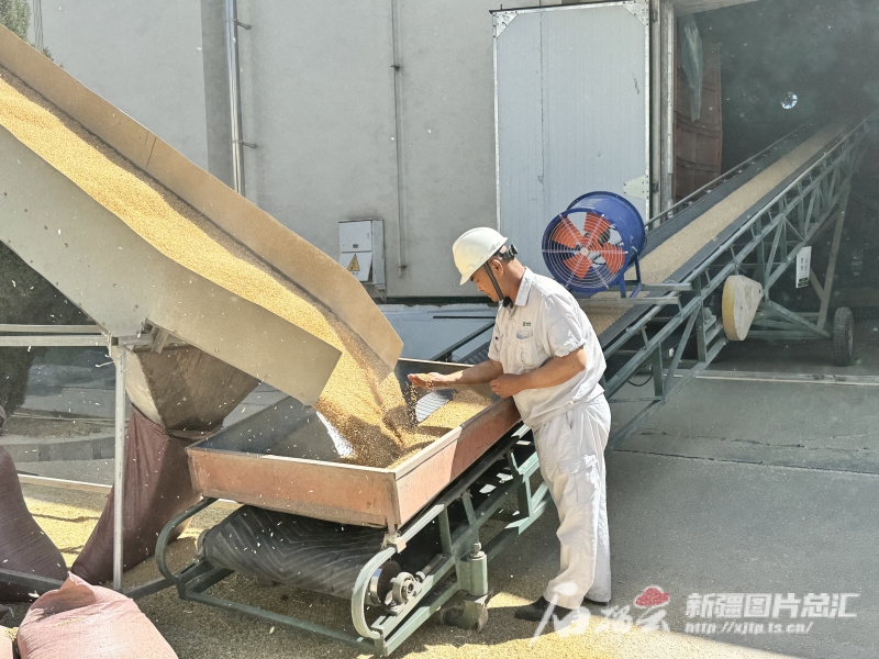 2024年夏糧收購期間,中儲糧伊犁直屬庫工作人員在查看入庫小麥品質情況。 石榴雲