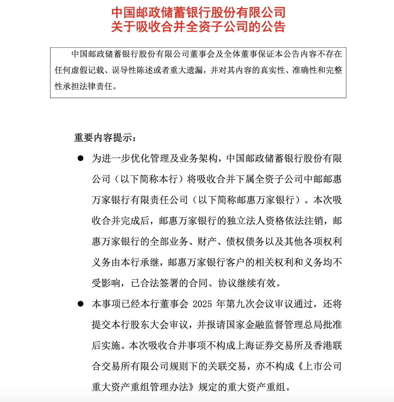 9月23日晚間,中國郵政儲蓄銀行股份有限公司發佈重要公告,宣佈將通過吸收合併方式整合其全資子公司中郵郵惠萬家銀行有限責任公司。