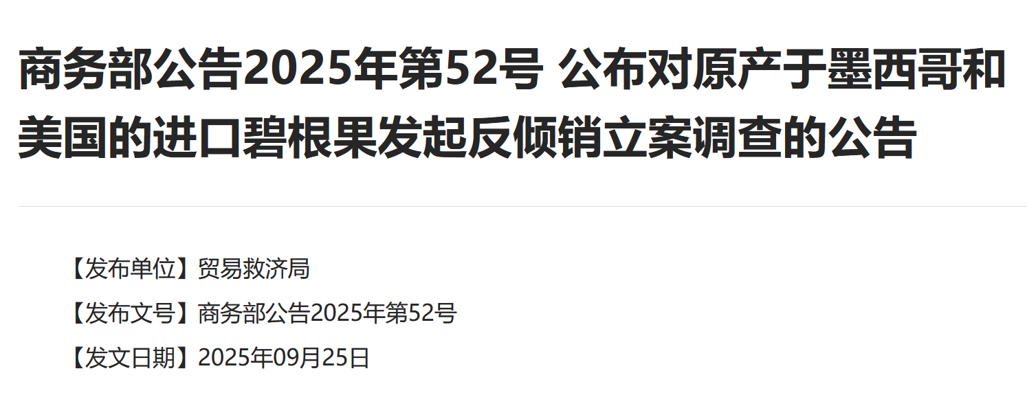 自本公告發布之日起,商務部對原產於墨西哥和美國的進口碧根果進行反傾銷立案調查,本次調查確定的傾銷調查期為2024年1月1日至2024年12月31日,產業損害調查期為2022年1月1日至2024年12月31日。