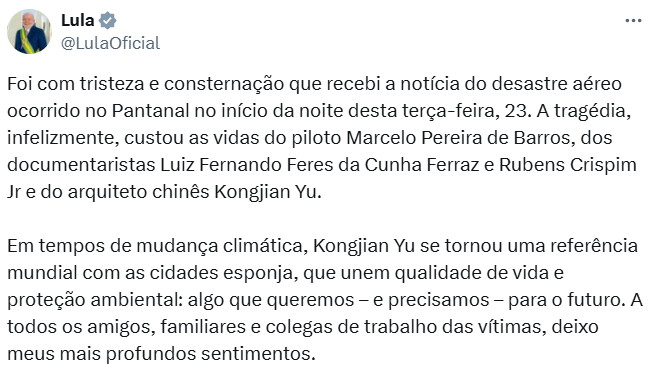 盧拉表示:“得知潘塔納爾空難的消息,我深感悲痛和震驚,這起空難於23日傍晚發生。不幸的是,飛行員馬塞洛·佩雷拉·德·巴羅斯、紀錄片製片人路易斯·費雷斯和魯本斯·克里斯平,以及中國建築師俞孔堅在這場悲劇中喪生。”