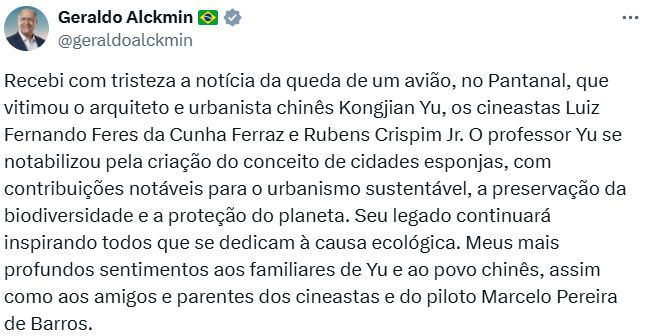 同日,巴西副總統阿爾克明也在X網站對遇難者表達深切哀悼,並表示:“俞孔堅教授因提出‘海綿城市’理念而聞名,他在可持續城市規劃、生物多樣性保護及地球生態保護領域作出了卓越貢獻。他的精神遺產將繼續激勵所有致力於生態事業的人們。”