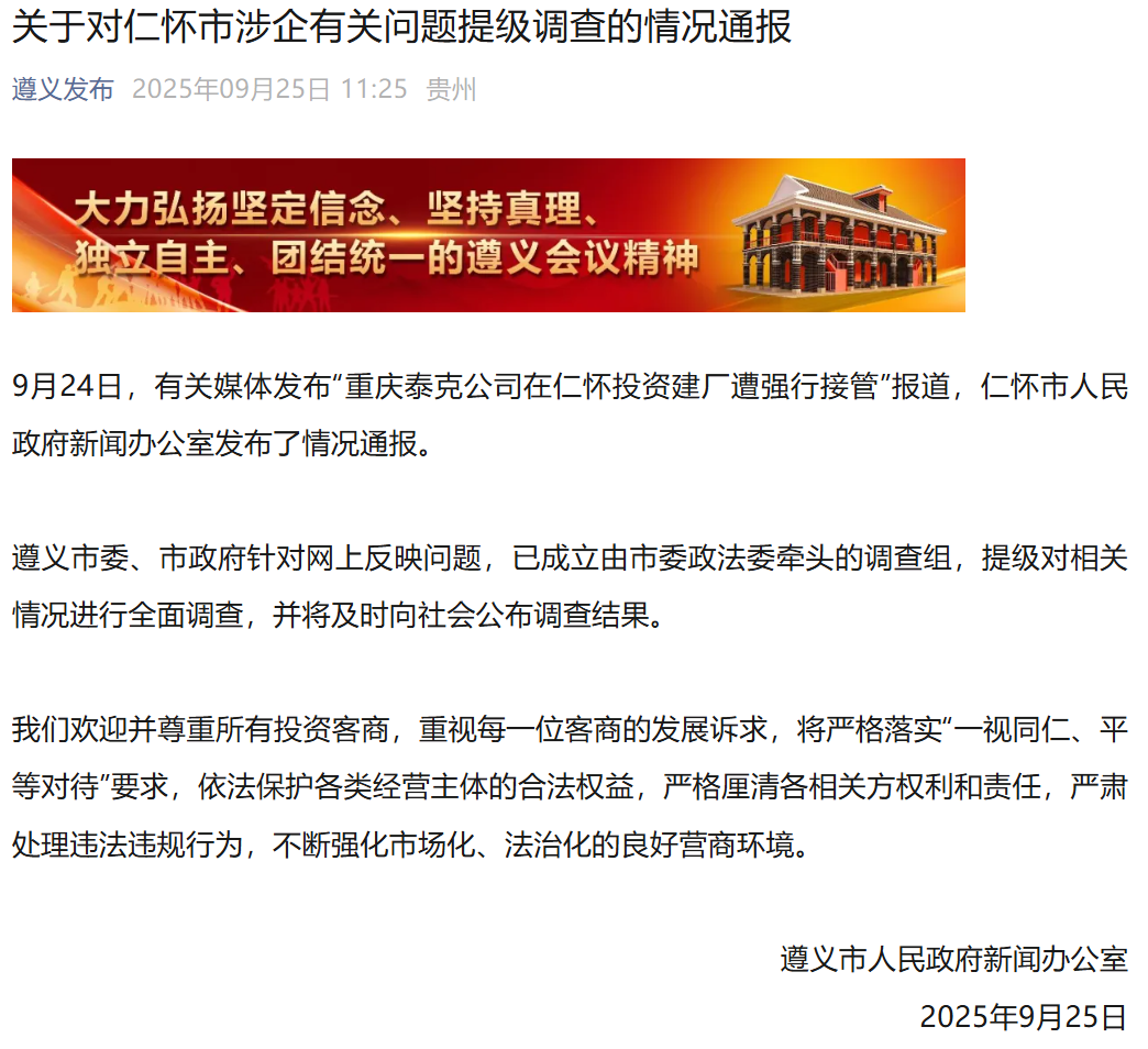 9月24日,有關媒體發佈“重慶泰克公司在仁懷投資建廠遭強行接管”報道,仁懷市人民政府新聞辦公室發佈了情況通報。