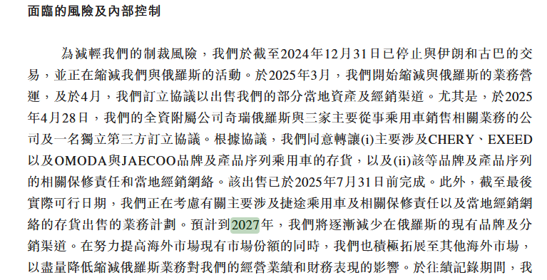 但業務縮減並不等於退出市場,奇瑞也在招股書中明確表示,其在相關地區的活動不構成一級制裁,且二級制裁風險相對有限。