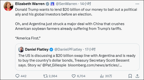 當地時間9月24日,沃倫在X平台發文稱:“特朗普想在(阿根廷)選舉前出借資金救助政治盟友及其全球投資者,那邊阿根廷反手就和中國簽了個超級大單,只剩咱們美國農民在關税戰裏有苦難言。是啊,美國優先。”