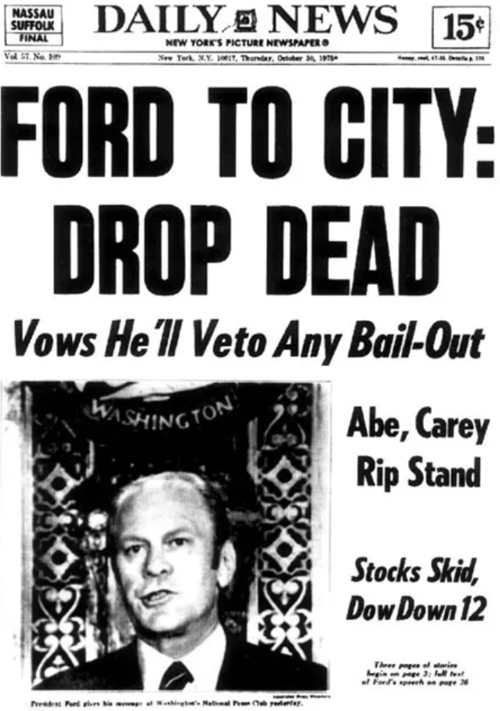 這句狠話源自1975年紐約市瀕臨破產時,一家小報《每日紐約新聞》用“去死吧”概括了美國前總統福特拒絕救助的態度。1970年代初,紐約市長期依賴短期借款維持開支,同時經濟衰退導致税收鋭減,社會支出不斷增加,財政赤字居高不下。銀行和投資者對市政債券信心下降,紐約市面臨實質性破產風險,急需聯邦援助以維持基本運轉。