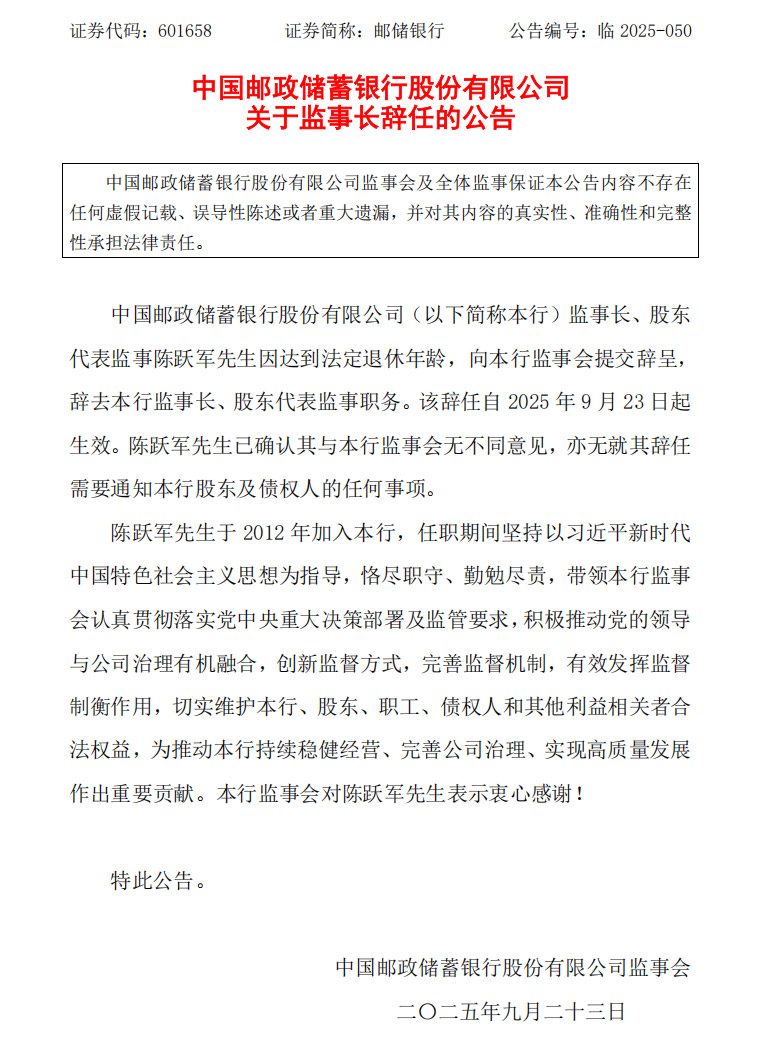 公告內容顯示,郵儲銀行監事長、股東代表監事陳躍軍因達到法定退休年齡,向該行監事會提交辭呈,辭去該行監事長、股東代表監事職務。該辭任自23日起生效。陳躍軍已確認其與該行監事會無不同意見,亦無就其辭任需要通知該行股東及債權人的任何事項。