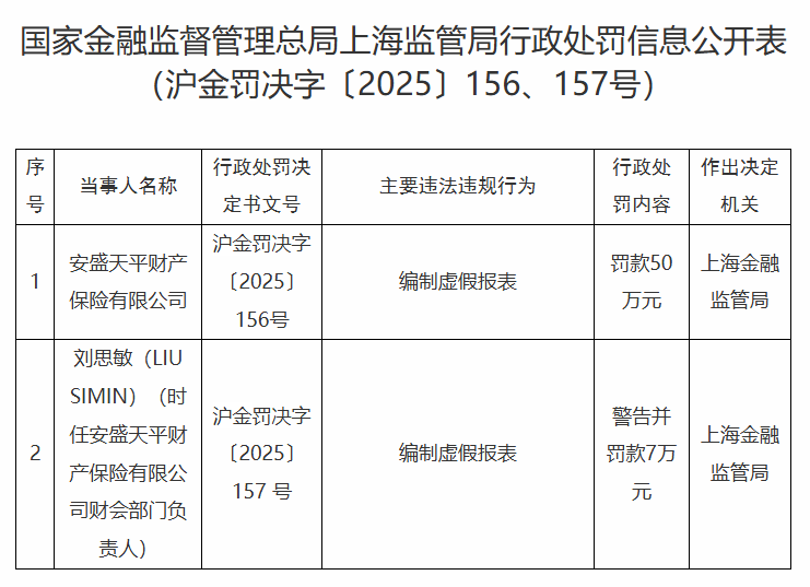 國家金融監督管理總局上海監管局行政處罰信息公開表顯示,時任安盛天平財會部門負責人劉思敏,也因編制虛假報表被警告並罰款7萬元。