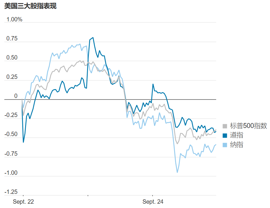 據《華爾街日報》、美國消費者新聞與商業頻道(CNBC)報道,當地時間9月24日,美股三大指數集體收低,這是美股連續第二個交易日收低。