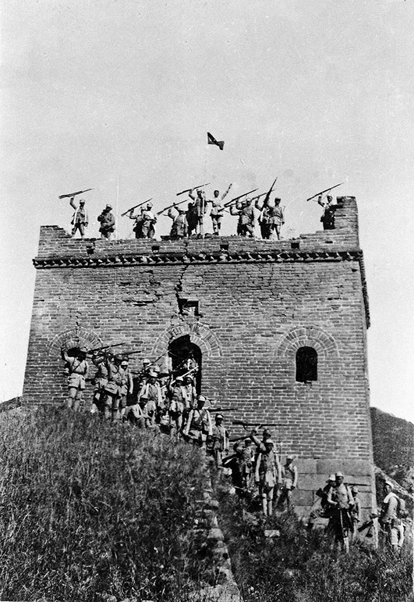 百團大戰中,八路軍攻克河北淶源縣日軍據點東團堡後,戰士們在長城烽火台上歡呼勝利(攝於1940年9月25日)