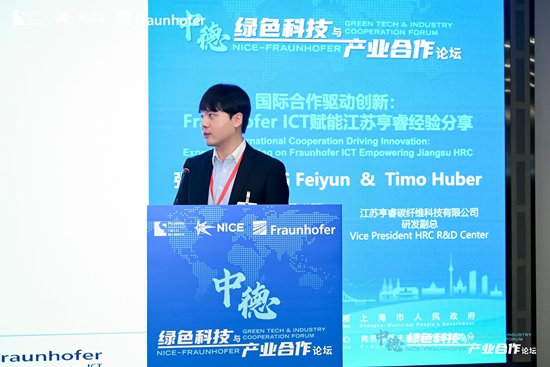 江蘇亨睿碳纖維科技有限公司研發副總蒂莫·胡貝爾(Timo Huber)與弗勞恩霍夫化學技術研究所(ICT)研究員兼項目經理張緋昀博士(如下圖),共同分享了ICT在技術研發與轉化中賦能江蘇亨睿的具體案例與合作成果。