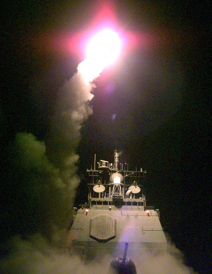 1999年3月北約空襲南聯盟期間,在亞得里亞海上的“菲律賓海”號於夜間向南斯拉夫境內發射“戰斧”巡航導彈 社交媒體