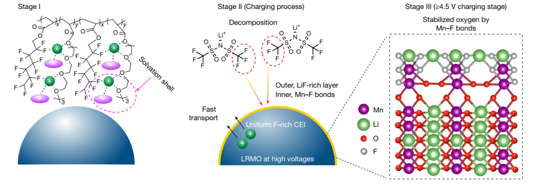 團隊在聚醚電解質中引入強吸電子含氟基團,顯著提升了其耐高壓性能,使其可匹配4.7 V高電壓富鋰錳基正極,實現了單一電解質對高電壓正極與金屬鋰負極的同步兼容。