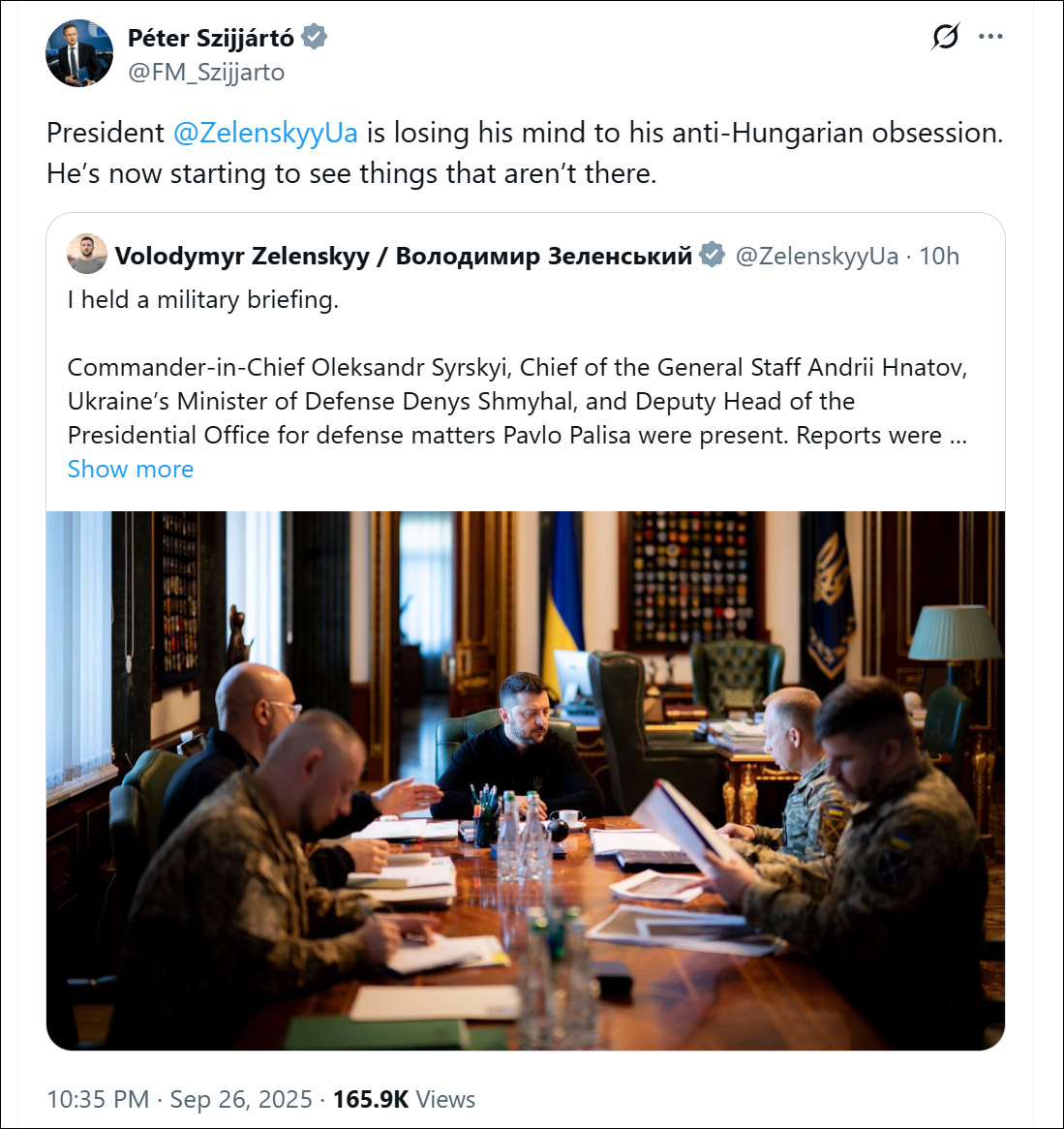 對此,匈牙利外交部長西雅爾多在相關貼文下方強烈否認這一指控。他表示,澤連斯基“因對匈牙利的執念而神志不清……現在開始看到根本不存在的東西”。匈牙利國防部也否認了澤連斯基的指控,並表示:“匈牙利國防軍並未實施所謂的烏克蘭邊境無人機飛行行動,也未收到任何相關指令。我們尚未收到烏克蘭方面關於此類事件的任何信息,但我們一直與烏克蘭保持聯繫。”