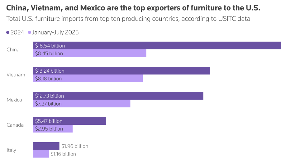 2024年,中國、越南和墨西哥是向美國出口傢俱最多的國家。路透社製圖