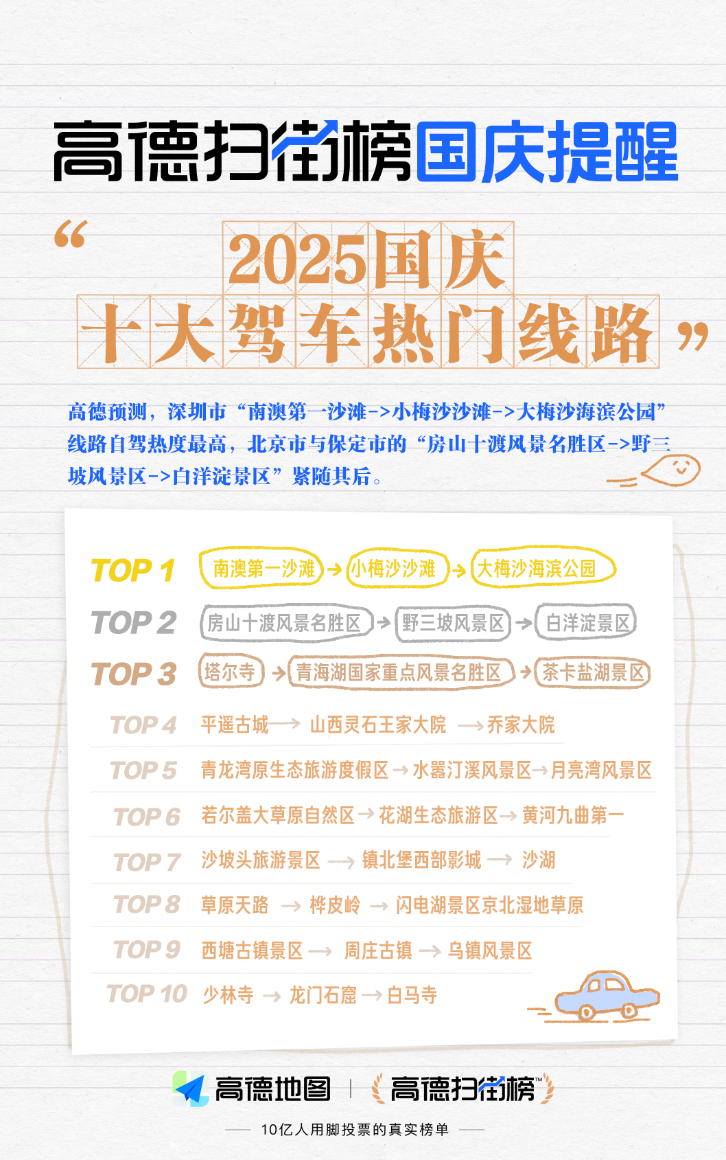 今天,2025年國慶假期全國駕車遊熱門路線TOP10也正式出爐。深圳市“南澳第一沙灘->小梅沙沙灘->大梅沙海濱公園”路線位居榜首;北京市與保定市的“房山十渡風景名勝區->野三坡風景區->白洋淀景區”排名第二。