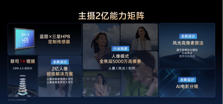 而作為“小王”的vivo X300則差異化地將這顆2億「藍圖×HPB」旗艦級傳感器用作主攝。這意味着標準版用户也能隨手拍出擁有驚人解析力的2億像素照片。vivo也同樣為其定製了專屬鏡頭模組、蔡司T*鍍膜及CIPA 4.5級的強大防抖。配合 NICE人像高像重建大模型與GTR人像高像素質感大模型,更使其在人像膚質與風光細節的還原上,達到了Pro級水準。