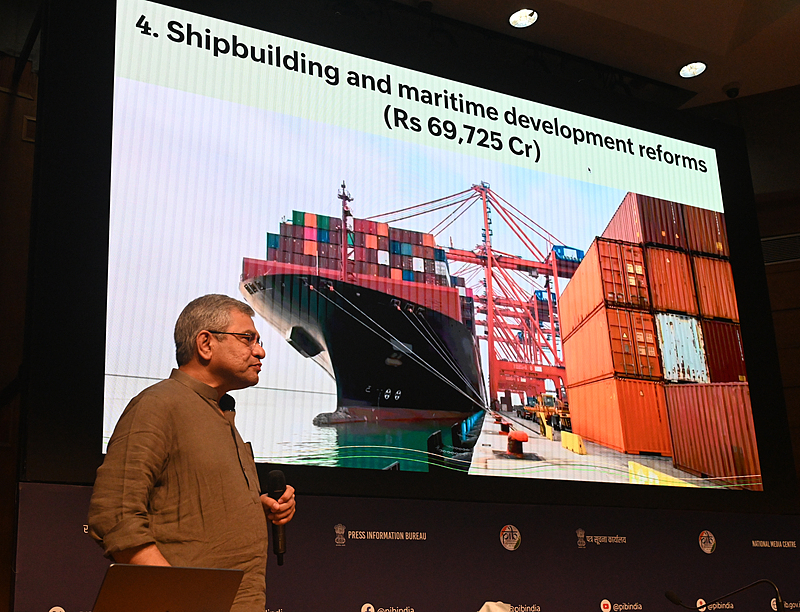 當地時間2025年9月24日,印度新德里,印度聯邦部長阿什維尼·瓦伊什瑙在國家媒體中心就內閣決定向媒體發表講話,其中包括為造船和海事部門提供的一項重大一攬子計劃,以及為鐵路員工發放獎金。 視覺中國
