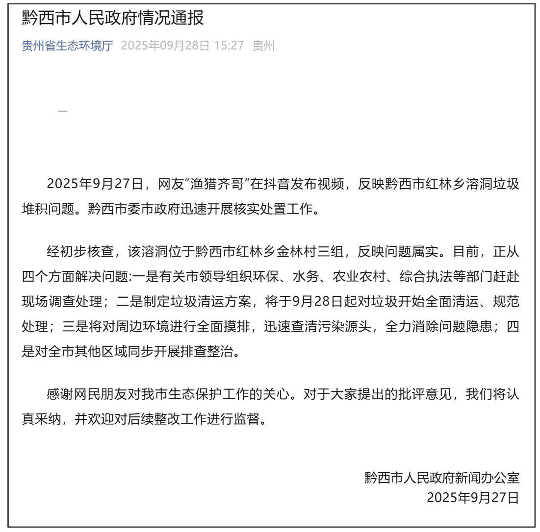 2025年9月27日,網友“漁獵齊哥”在抖音發佈視頻,反映黔西市紅林鄉溶洞垃圾堆積問題。黔西市委市政府迅速開展核實處置工作。
