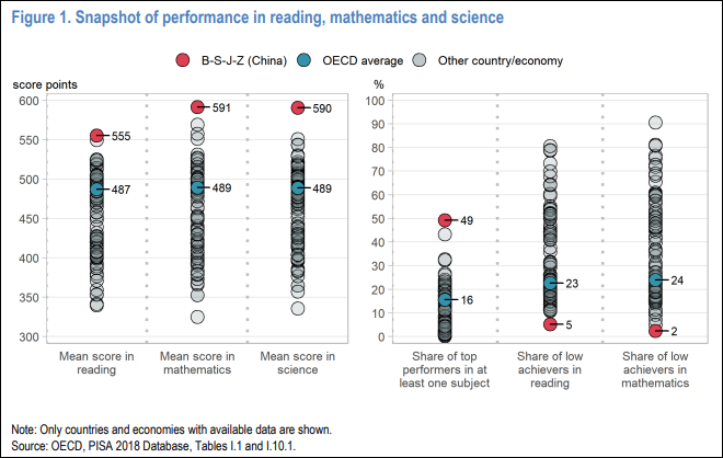 **而搜索PISA更早的2018年測驗結果報告,當時則包括了中國四個地區(北京、上海、江蘇、浙江)的學生成績。報告顯示,中國15歲青少年在數學能力上排名第一,而美國則排名第25。**事實上,在這份報告中,中國學生在閲讀和科學能力上也高居第一。