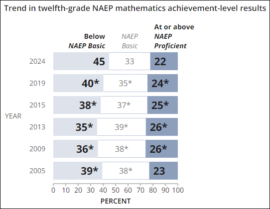 根據美國《國家教育進展評估報告》(NAEP),2024年,45%的美國高中生數學課目的得分低於“基本”水平。 NAEP報告截圖