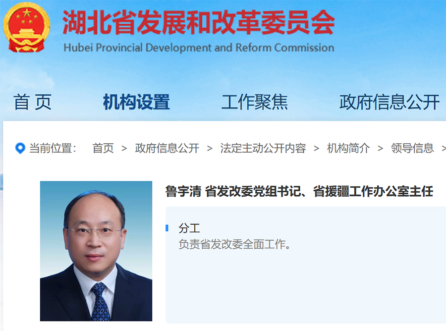 9月28日,湖北省發展和改革委員會網站“領導信息”一欄顯示,魯宇清已任湖北省發改委黨組書記、省援疆工作辦公室主任,負責省發改委全面工作。