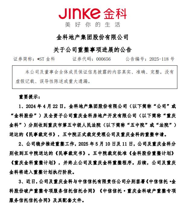 金科股份表示,2025年5月10日及11日,公司及重慶金科分別收到五中院送達的《民事裁定書》。五中院裁定批准《金科股份重整計劃》《重慶金科重整計劃》,並終止公司及重慶金科重整程序。後續,金科股份及重慶金科將進入重整計劃執行階段。
