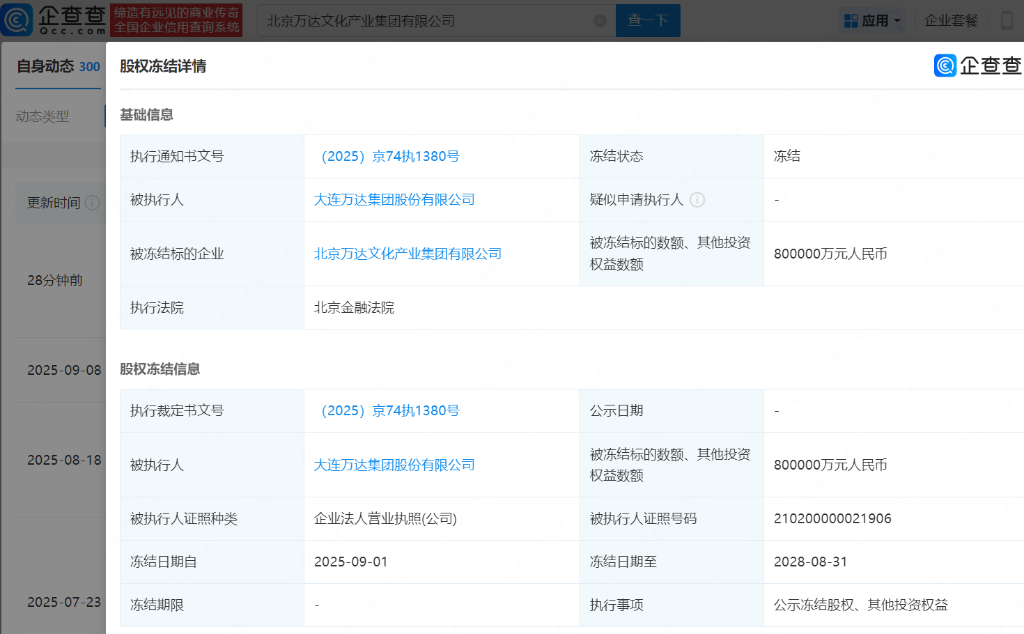 另據企查查APP顯示,近日,北京萬達文化產業集團有限公司再次新增1條股權凍結信息,被執行人為大連萬達集團股份有限公司,凍結股權數額為80億元,凍結期限為2025年9月1日至2028年8月31日,執行法院為北京金融法院。