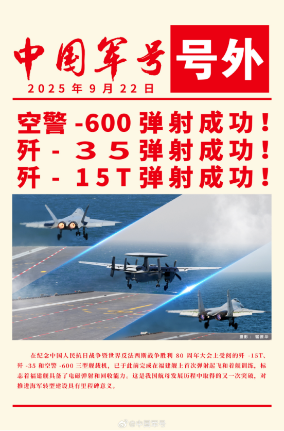 託養雞老爺的福,筆者此前已瞭解到“福建”艦早在第七次海試期間就完成了彈射。但當這一天真的來臨,筆者從手機上看見18艦的電磁彈射裝置將飛機以反直覺的加速度放飛海鷲之時,激動之情仍難以言表。無論是《攻堅》專題片戛然而止的彈射畫面,還是央視軍事就彈射起降“明知故問”的一次次刺撓,軍迷屬實被活活“折磨”了兩個多月。而在長春航展後勁兒剛過、國慶假期尚未到來的9月22日,“福建”艦的彈射畫面可謂是“壓抑到極致的極致爆發”,一鳴驚人,讓大夥提前過了個好節。9月22日確實是個好的日子。