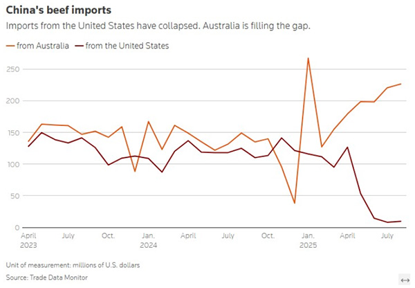 貿易數據顯示,7月美國對華牛肉出口額僅為810萬美元,8月為950萬美元,而去年同期的數字分別為1.18億美元和1.25億美元。這些市場份額迅速被澳大利亞搶佔,其對華牛肉出口額從月均1.4億美元,躍升至7月的2.21億美元和8月的2.26億美元。