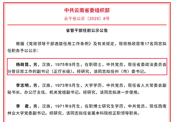 微信公眾號“雲南發佈”消息,9月28日,雲南省委組織部發布一批幹部任前公示,其中,楊政昆擬任州(市)委書記。