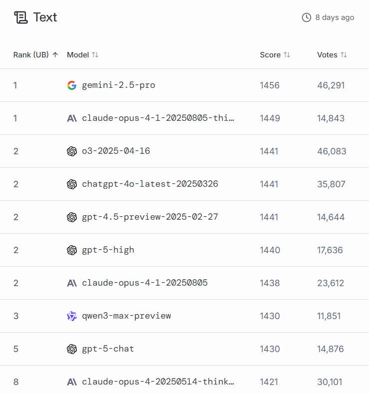 (注:LMArena採用了經過複雜調整的排名方式,旨在去除一些統計偏差,其排名反映的是模型能力等級,而非完全取決於其身前模型的數量)