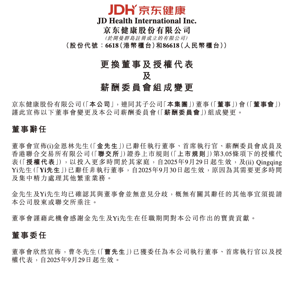 9月29日,京東健康股份有限公司(06618.HK)發佈重要人事變動公告,宣佈公司管理層和董事會成員出現重大調整。據公告,該公司執行董事兼首席執行官金恩林正式卸任,曹冬接替其職務,成為京東健康新任CEO。